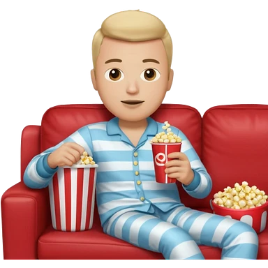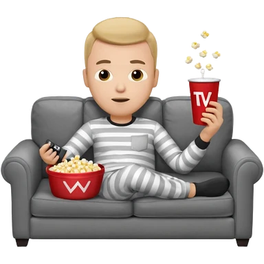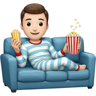 male memoji, lazy man in pajamas, lying on couch, holding TV remote, relaxed face, casual home vibe, popcorn bucket, watch tv emoji