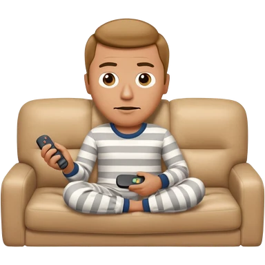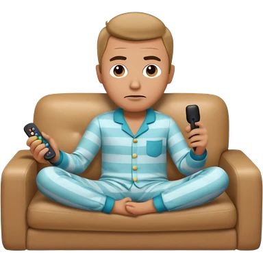 male memoji, lazy man in pajamas, lying on couch, holding TV remote, relaxed bored face, casual home vibe emoji