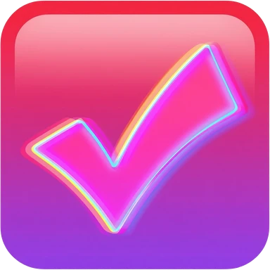"Custom YouTube tick emoji, glitch effect checkmark, red-pink-purple gradient, digital distortion, cyberpunk neon glow, transparent background, 109x109px" emoji