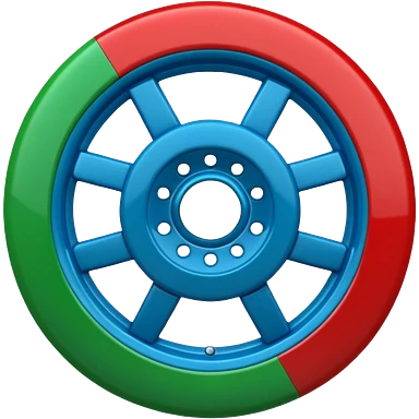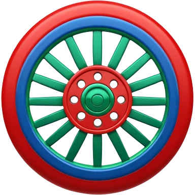 Glossy 3D emoji, blue top, green bottom, large red spoked wheel in center. Geometric symbol, no face. emoji