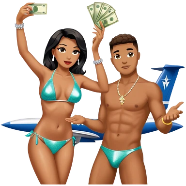 tefi valenzuela wearing diamond sparkle bikini and josh king madrid standing on private plane throwing money at her emoji