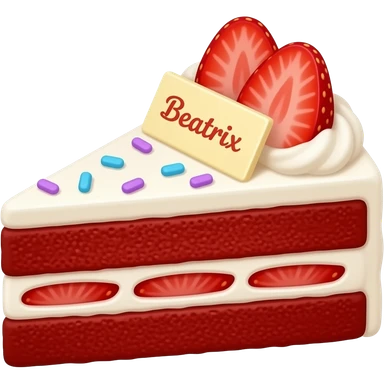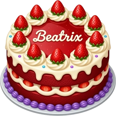 A red velvet layer cake with purple and blue sprinkles and whipped cream with strawberries and strawberry jello writing saying Beatrix emoji