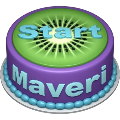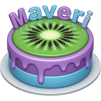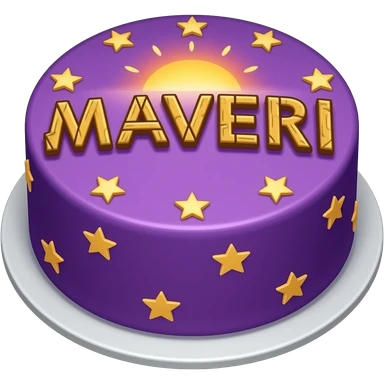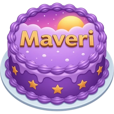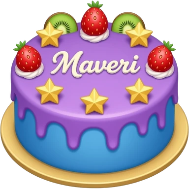 Make a cake with cute strawberry cursive writing saying Maveri and the whole cake is purple and blue with golden stars and kiwi and strawberry decorations emoji