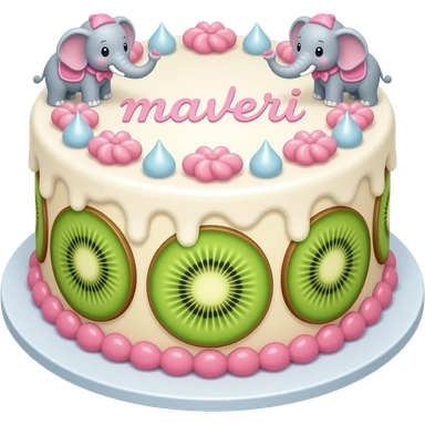 Create a cake that is based off kiwi, magic and elephants. Make it have pink flower writing saying maveri emoji