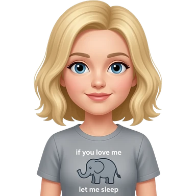 Make Maveri as a girl with blonde hair and a gray elephant shirt that says if you love me let me sleep emoji