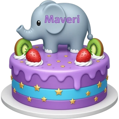 Make a cake with elephant writing saying Maveri and the whole cake is purple and blue with golden stars and kiwi and strawberry decorations emoji