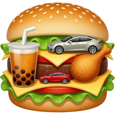 boba tea, tesla and fried chicken in a sandwhich emoji