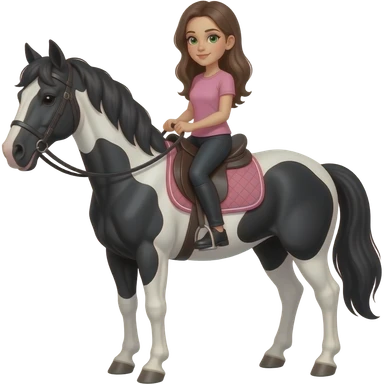 Брюнетка в розовой футболке и черных штанах с зеленими глазами ездит верхом на большом чорно белом коне emoji
