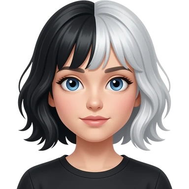 The classique emoji with half black half platinium hair, the black on top and platinium underneath, light skin and blue eyes fliping her hair emoji