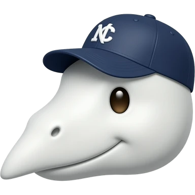 face close-up emoji of a cute white dinosaur with a long pointed snout, small dark eyes, smooth white scales, wearing a navy blue baseball cap with NC logo, friendly expression, round face, cartoon emoji style, no body emoji