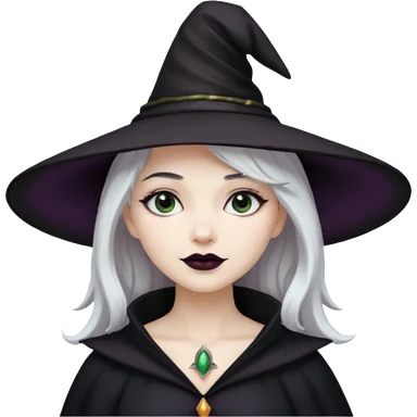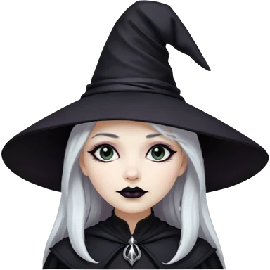White hair pale skin woman with black lipstick, black eyeshadow, gothic style wearing a witch hat emoji