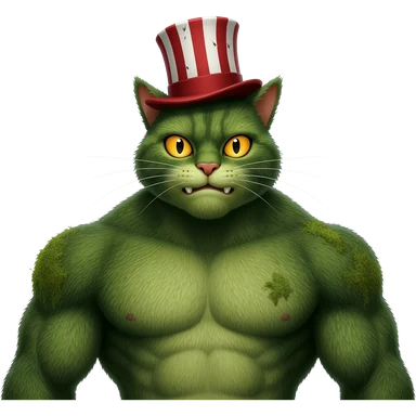 Shrek’s broad build and swampy texture—mixed with the tall, lanky proportions of the Cat in the Hat. He has small ogre ears poking through a slightly tattered red-and-white striped top hat. Hyper-realistic fur and skin textures, expressive CGI facial animation, comedy ogre cartoonish elasticity. emoji