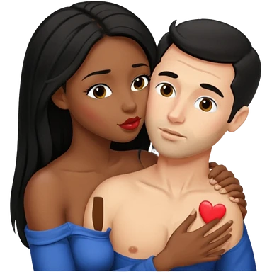 Tan European male wearing blue and smiling and hugging a jet black African girl in purple clothes with blue jewelry emoji