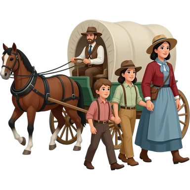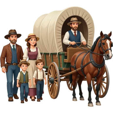 pioneer family on the oregon trail with husband driving the wagon and wife and children walking facing sideways emoji