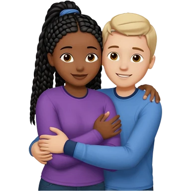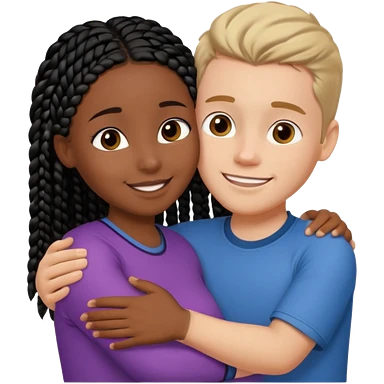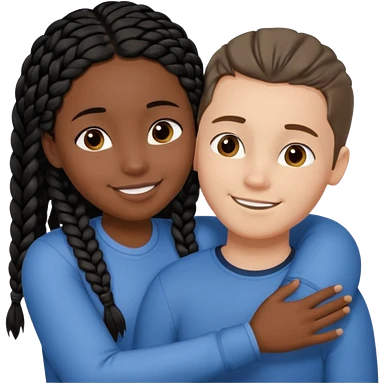 Dark black girl with black braids and tan white boy with curvy straight brown hair, they are hugging and smiling, and touching each other with their hands emoji