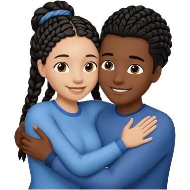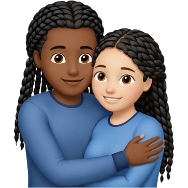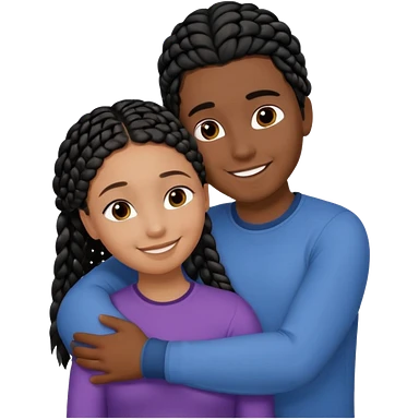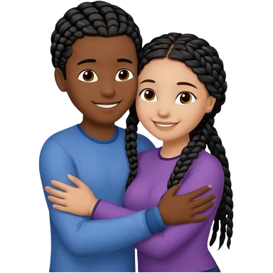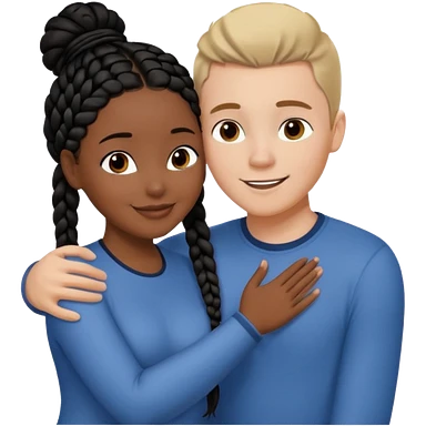 Dark black girl with black braids, smiling, and embracing her tan white boyfriend with straight brown hair emoji