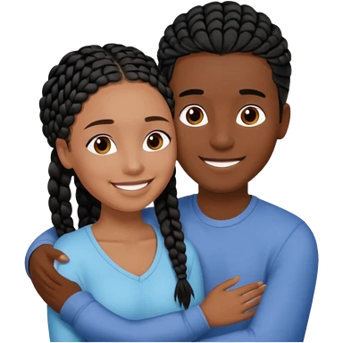 Dark black girl with black braids and dark tan white boy with curvy straight brown hair, they are hugging and smiling, and touching each other with their hands emoji
