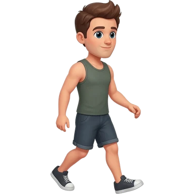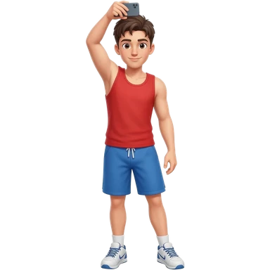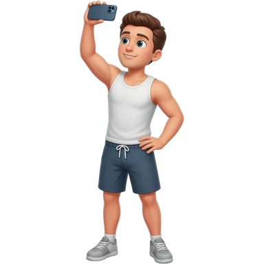 Generate a male standing and holding his phone in front and above to make it seem like hes taking a selfie but of his whole body to show to the camer a hes standing. Make him wearing just a tank top and shorts. emoji