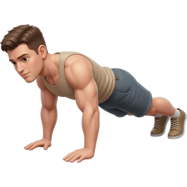 guy with light tan doing push up show his face but rest of body too, solid muscle mass and shoes on. tank top on with shorts. Make sure hes 1/2 way dwon on the push up not in plank positon emoji