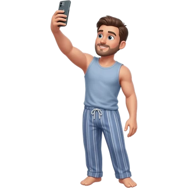 guy in pajamaspants and tank top standing holding up his phone up high and in front of him to show the camera his entire body. have him at a slight angle and looking at the phone. holding the phone vertically. holding it as high up as he can and angled dwon to point at him emoji