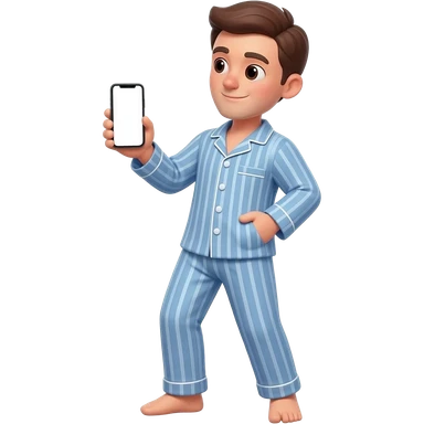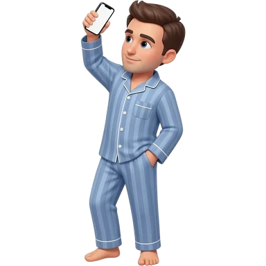 guy in pajamas standing holding up his phone up high and in front of him to show the camera his entire body. have him at a slight angle and looking at the phone. holding the phone vertically. holding it as high up as he can and angled dwon to point at him emoji