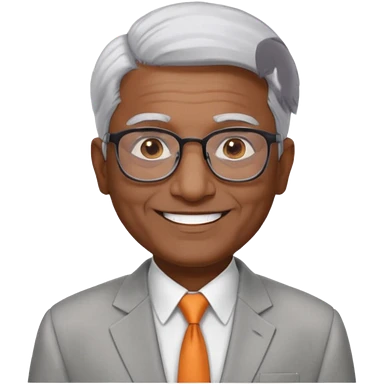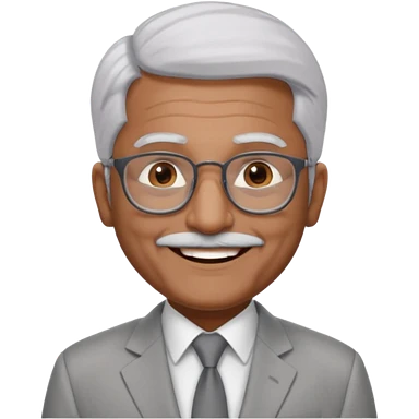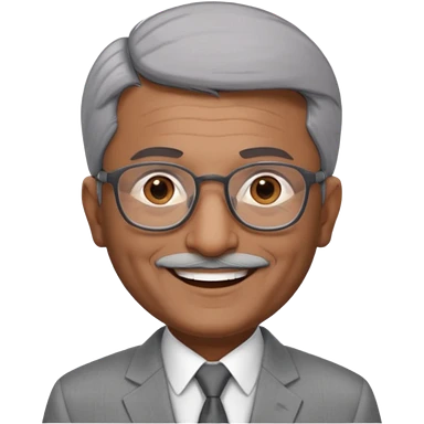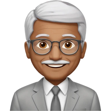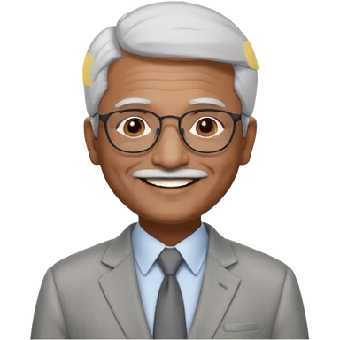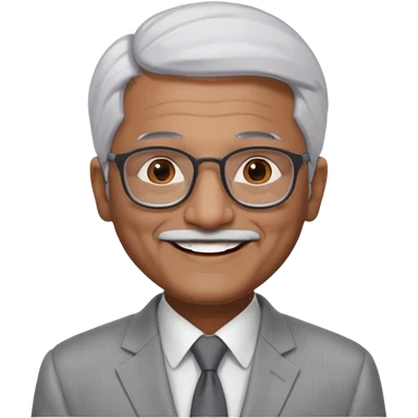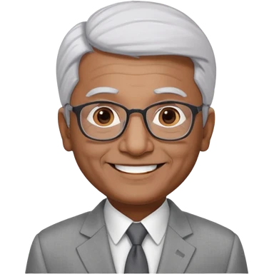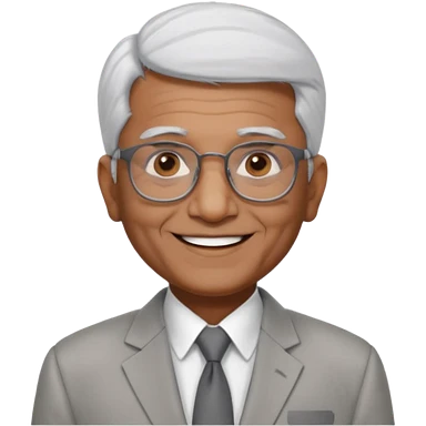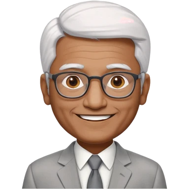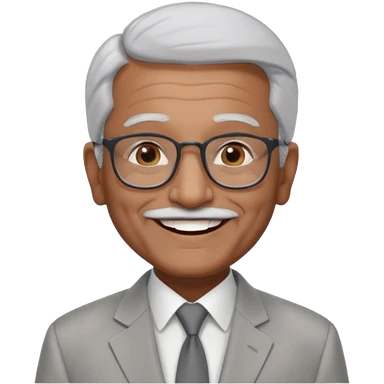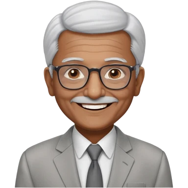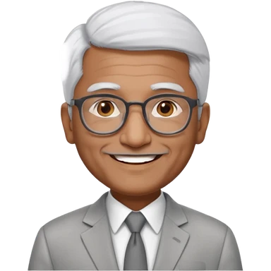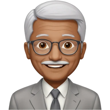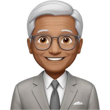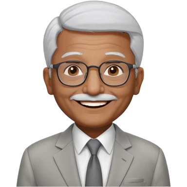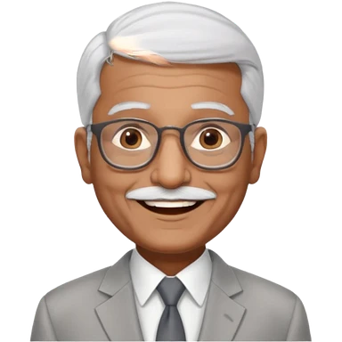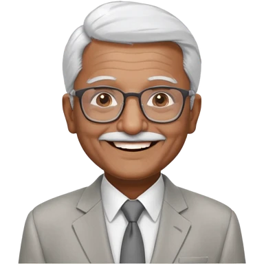 70 yr old indian man, short straight white hair brushed back, light grey business suit, big smile, dark brown skin, no moustache, dark brown eyes, glasses emoji