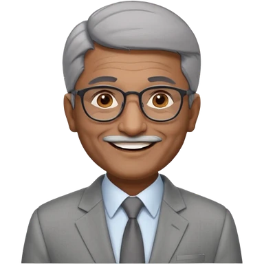 60 yr old indian man, short straight white hair brushed foreward , light grey business suit, big smile, dark brown skin, no moustache, dark brown eyes, glasses emoji