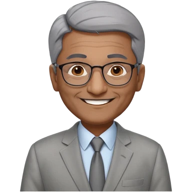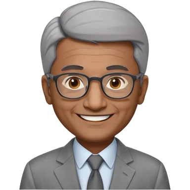 60 yr old indian man, short straight dark grey hair brushed foreward , light grey business suit, big smile, dark brown skin, no moustache, dark brown eyes, glasses emoji
