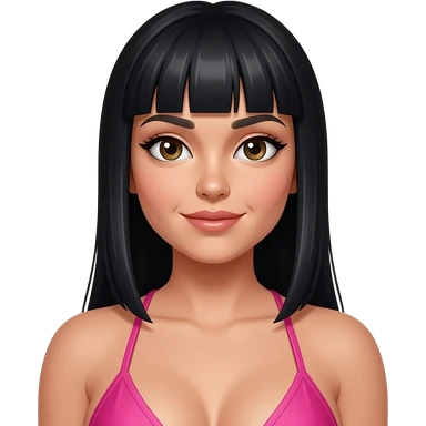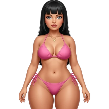 Nicki with straight black hair, pink thong bikini, full body, big butt emoji