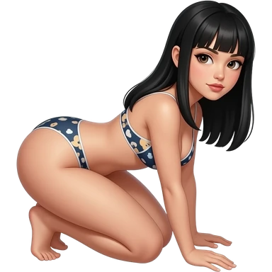 straight long black hair, panties, full body, back view, big butt, face looking at you, crouching emoji