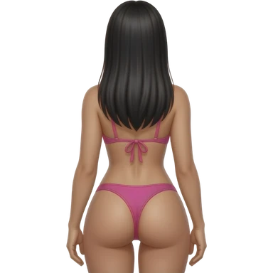 Nicki with straight long black hair, pink thong bikini, full body, back view, big butt emoji