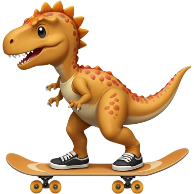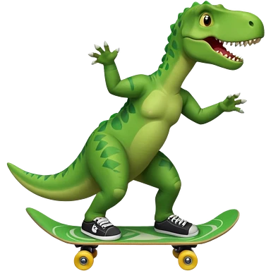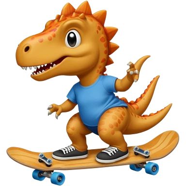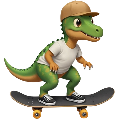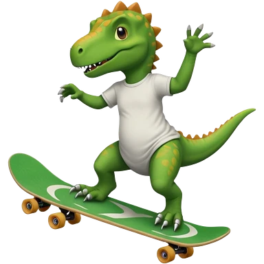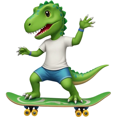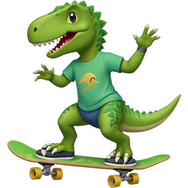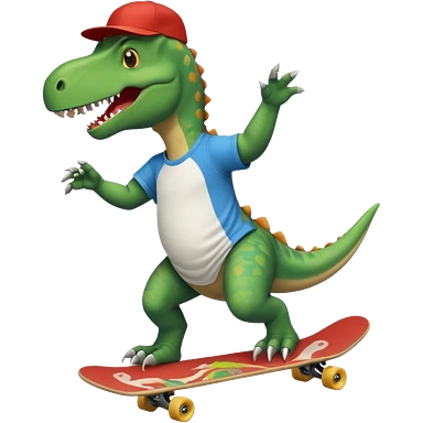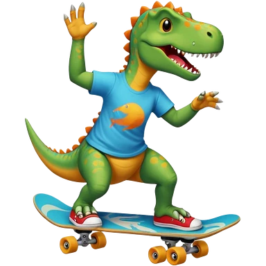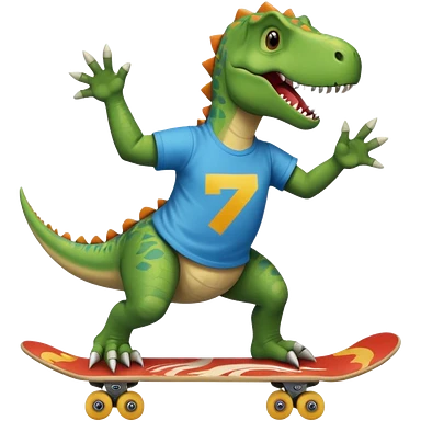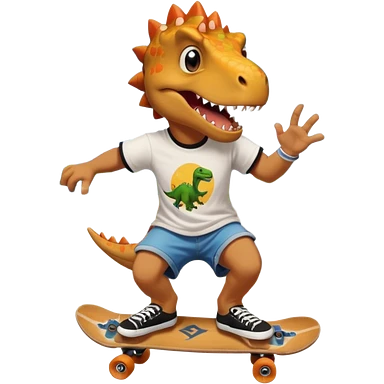 Dinosaur skateboarding at the skate park wearing a t-shirt and doing six seven and dancing emoji