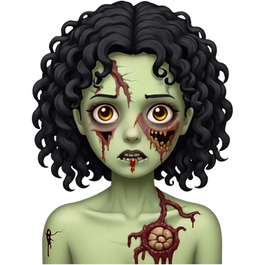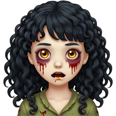 Emoji garota zombie sem ferimentos no rosto com cabelo preto cacheado longo com franja cacheada sem volume emoji