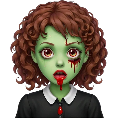 Green zombie emoji girl with curly Brown hair, with curly bangs, wearing a black bluse, blood Just in the tongue emoji