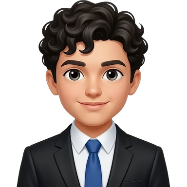 A white boy with black haired curly hair, black blazer, blue tie and white shirt emoji