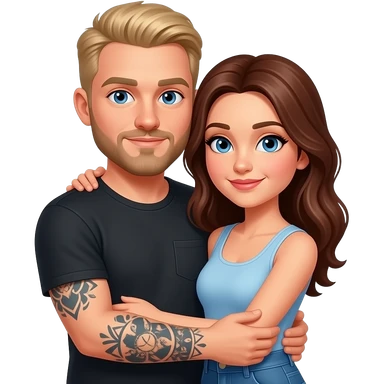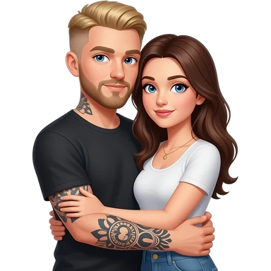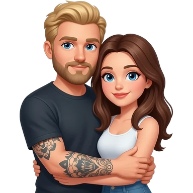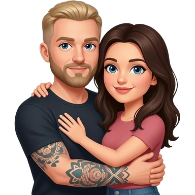 Un couple avec un gars blonc foncé aux yeux bleu, avec une barbe, tatoué et une femme châtain aux yeux bleus, au teint très clair, qui se font un câlin emoji