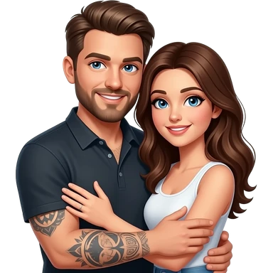 Un couple avec un gars blonc aux yeux bleu, avec une barbe, tatoué et une femme châtain aux yeux bleus, au teint très clair, qui se font un câlin emoji