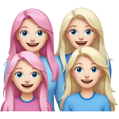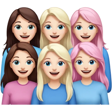 Girlfriend emoji - four white grips hugging and smiling One girl with long light pink hair and blue eyes, one girl with blue eyes and light blonde hair, and 2 girls with brown eyes and long dark brown hair. emoji