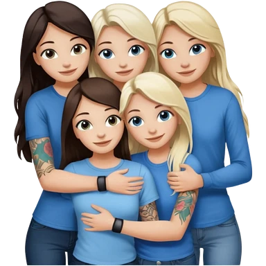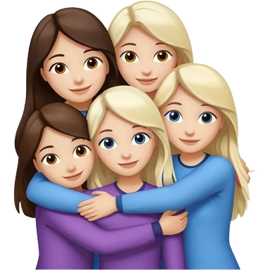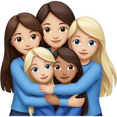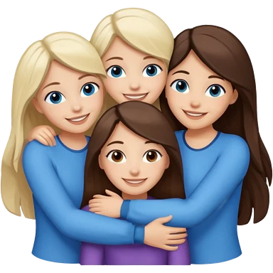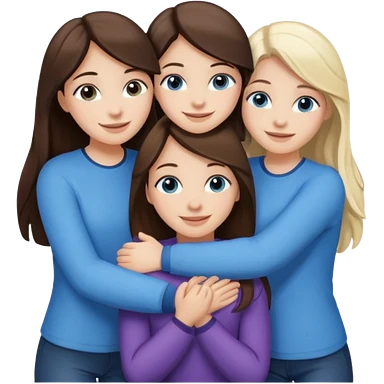 four white girlfriends hugging and smiling 2 girls with brown eyes and long dark brown hair. Two girls with blue eyes and light blonde hair emoji