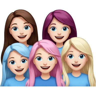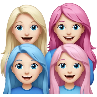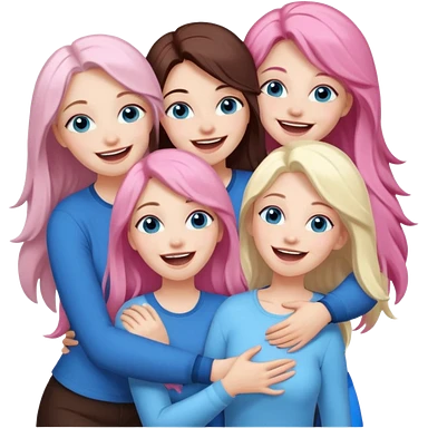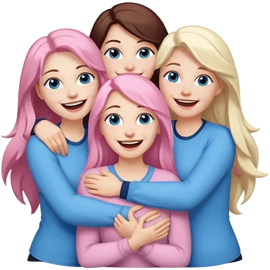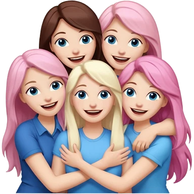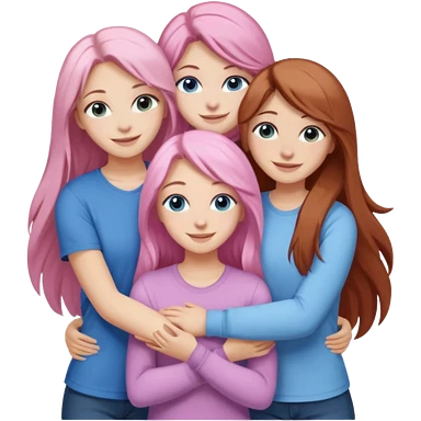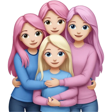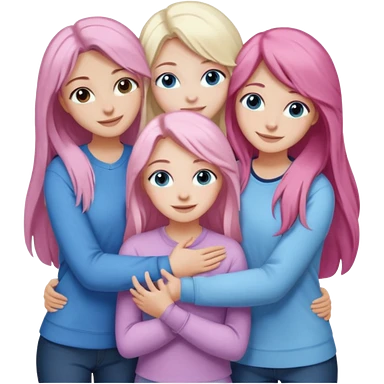 four white grips hugging and smiling One girl with long light pink hair and blue eyes, one girl with blue eyes and light blonde hair, and 2 girls with brown eyes and long dark brown hair. emoji