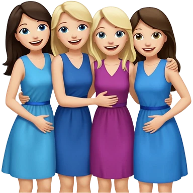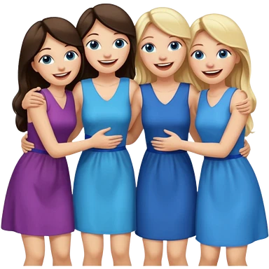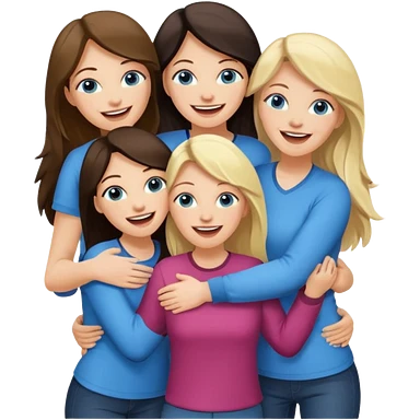 four adult white women laughing and hugging. Two have long dark brown hair. Two have blonde hair and blue eyes. emoji