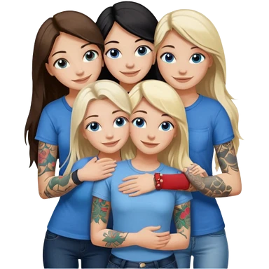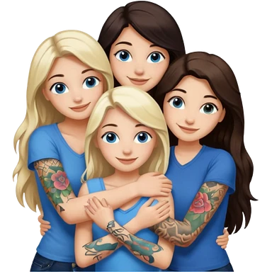 four white girlfriends hugging and smiling 2 women with brown eyes and long dark hair. Two women with blue eyes and light blonde hair. They like tattoos and getting in trouble emoji