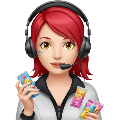A woman with red hair and gaming headset holding a condom packets emoji