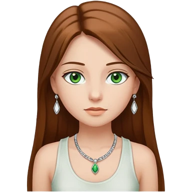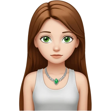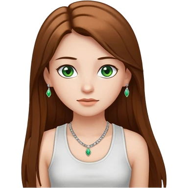 A girl with long brown straight hair, green eyes, and a white tank top; she doesn't have bangs. she wear a lot of silver jewerly tan skin emoji