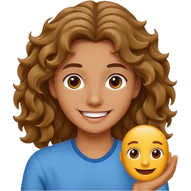 Teacher emoji but : wavy dark brown hair, light western skin, no glasses, dark eyes, with a computer folder in the hand (color is yellow), being a teacher, wearing pink backpack, smile with teeth emoji