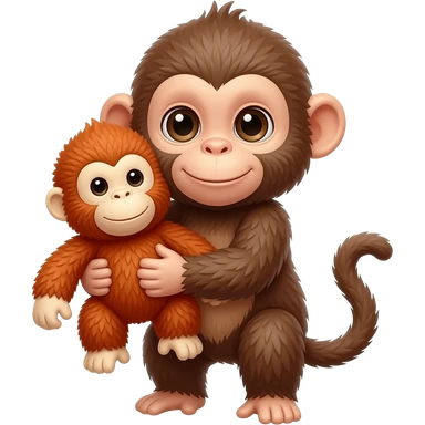 Un mono bebé y que tenga en la mano un peluche de un orangután y que el mono este abrazando al peluche de orangután emoji