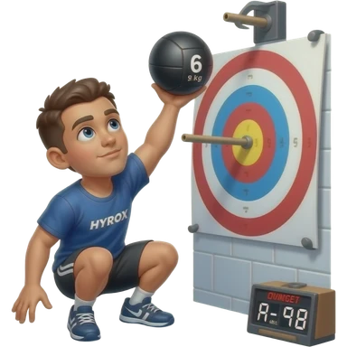 Full-body photograph of a HYROX competitor performing Wall Balls in the dedicated station. They are squatting low, eyes fixed upward, launching a 6kg/9kg medicine ball toward the 9ft/10ft target. Bright, cool arena lighting. Visible race clock displaying an advanced time. emoji