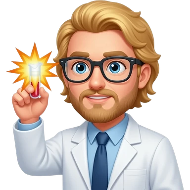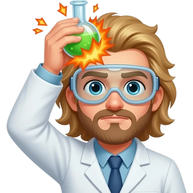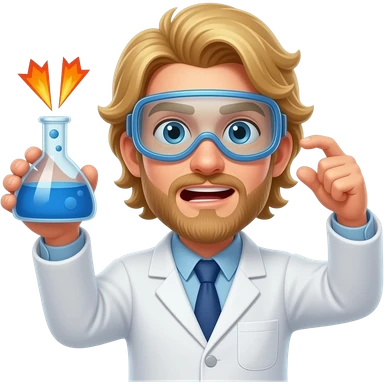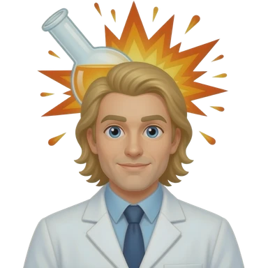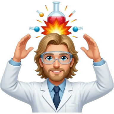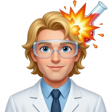 male scientist with long blond hair wearing googles experiencing a flask explosion emoji