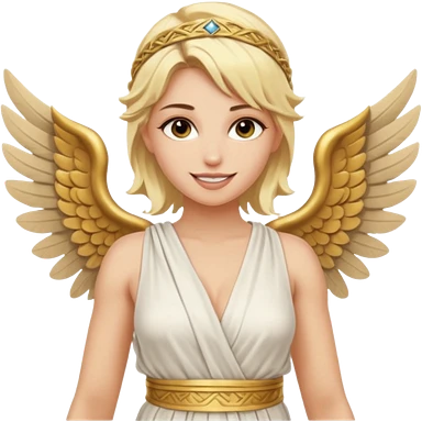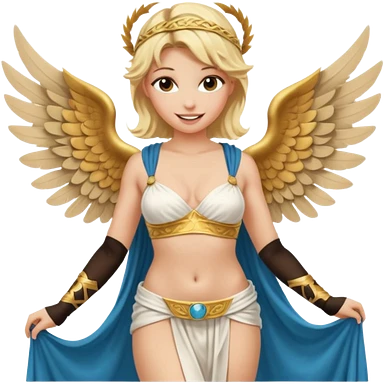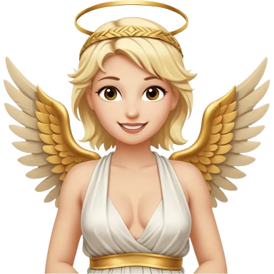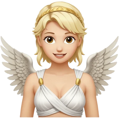 Sexy, edgy, smiling, blond woman, who is a winged, sensual goddess dressed in a very scantily revealing greek toga emoji