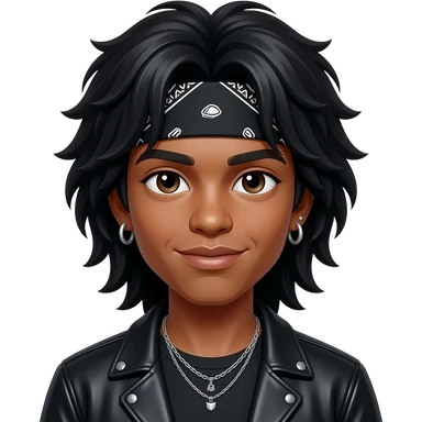 Un chico rockero Moreno de cabello negro y largo estilo 80s cin una bandana e la frente emoji